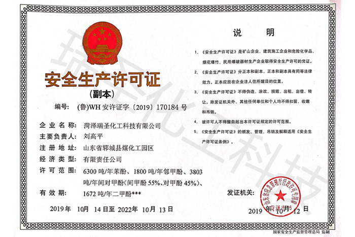 菏澤瑞圣化工科技有限公司是國內酚類產品的生產企業。公司現有年加工粗酚20000萬噸的生產裝置及能力,可生產苯酚、鄰甲酚、間對甲酚、二甲酚等產品。產品廣泛應用于合成樹脂、香料、染料、絕緣材料、阻燃劑、農藥、醫藥、中間體等精細化工領域。本公司以誠為本,信譽保證,靠過硬的產品質量和完善的服務贏得了國內外廣大用戶的贊譽。產品暢銷國內二十多個省市地區,并地打入了國際市場,產品遠銷意大利、巴西、印度、韓國、日本、臺灣等國家和地區。